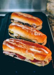| Famous Miami Cuban Sandwich Recipe - Food.com butter, pork chop, pork loin, dill pickle, swiss cheese, olive oil, pepper, parsley, paprika, cumin, garlic, ham, salt, light corn syrup, lime juice A taste of Miami on your dinner table! You can smell these sandwiches cooking all over Miami Beach. Taking a walk down there is something to experience. This recipe is a taste of heaven on a roll. Thi...