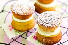 | Mini Victoria sponge cakes with lemon curd and cream - Recipes - delicious.com.au butter, icing sugar, eggs, lemon curd, baking powder, sugar, whipped cream, milk, flour Create a high tea experience at home with these dainty little cakes. 1. Preheat the oven to 170 C. Grease and flour two 12-hole patty-pan tins. 2. Using electric beaters, beat butter and caster sug...