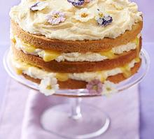 | Lemon cake with lemon curd and double cream recipe - BBC Food butter, candied lemon peel, icing sugar, cornstarch, lemon, eggs, baking powder, sugar, self raising flour, double cream A stunning three-tiered cake filled with homemade lemon curd and cream. To save time, use a good quality ready-made lemon curd. Preheat the oven to 180C/350F/Gas 4. Grease and line three 20cm/8in sand...