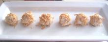 | Curried Chicken Rolled in Toasted Coconut Recipe - Food.com chicken breast, chicken stock, walnut, curry powder, coconut, onion, salt, mayonnaise, cream cheese By Serena Bass and found at Leite's Culinaria. These are wickedly-good, little appetizers. Serving Size: 1 (998) g Servings Per Recipe: 1 AMT. PER SERVING % DAILY VALUE Calories: 67.2 Calories...