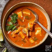 | Coconut Chicken Curry Soup Recipe | SparkRecipes chicken breast, red onion, curry paste, chicken stock, ginger root, coriander leaf, chili pepper, coconut milk, lime, spring onion, garlic, fish sauce, lime juice, water Stopping in at a deli in a high-end grocery store, I was hungry for lunch and enticed by the smells coming from the soup and salad bar. This soup was new for me, and beyond delicious so I ran right ho...