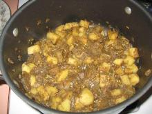 | Spicy Curried Eggplant and Potato (Baingan Bharta) Recipe | SparkRecipes olive oil, curry powder, pepper, cloves, chili pepper, potato, onion, aubergine/eggplant, salt, water Spicy and tasty although not the most attractive Start off by peeling and dicing the eggplant and potato into cubes (set aside in a bowl). Then peel and slice the onion, pepper and crush the garlic. P...