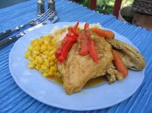 | Honey Curried Chicken and Vegetables Recipe - Food.com butter, chicken stock, curry powder, cayenne pepper, dried ginger, potato, carrot, onion, garlic, whole chicken, mustard, honey, water This is a sweet curry one-dish meal that's easy to make and eat. :-)Different than most curry dishes. Serving Size: 1 (322) g Servings Per Recipe: 6 AMT. PER SERVING % DAILY VALUE Calories: 754...
