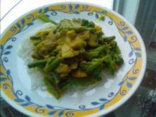 | Coconut Ginger Mango Curry Recipe | SparkRecipes butter, creamed coconut, vegetable stock, curry powder, ginger root, mango, mushrooms, asparagus, broccoli, noodles A perfect blend of curry, coconut, ginger and mango with broccoli and asparagus. Melt butter in saucepan. Add sliced ginger and mushrooms and saute until soft. Cut asparagus into 2 inch pieces and sl...
