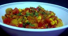 Curried Tomatoes and Chickpeas olive oil, curry powder, pepper, ginger root, chickpea, spring onion, tomato, salt, lime juice 1. Heat the oil in a large skillet over medium heat. Cook the white parts of the scallions, the ginger, and the curry powder until fragrant, 1 to 2 minutes. 2. Add the tomatoes and cook until beginnin...