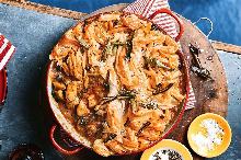 | Chicken curry pie with garlic filo recipe - Recipes - delicious.com.au chicken thigh, phyllo pastry, chicken stock, curry powder, sesame seed, curry leaf, onion, garlic, aubergine/eggplant, spinach, lemon juice, flour, ghee Filled to the brim with comfort and flavour, this filo pie will make the whole family happy. 1. Preheat oven to 200 C. Place chicken on a large oven tray and scatter over 2 tsp curry powder. Season. ...