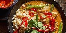 | Thai Yellow Chicken Thigh Curry Recipe | EatingWell chicken thigh, red bell pepper, curry paste, peanut oil, peanut, coriander leaf, coconut milk, lime, onion, green beans, fish sauce, rice, water Yellow curry paste is generally spicier than green but not as spicy as red, making it just right for this easy stir-fried chicken thigh recipe. Sizzling the curry paste in oil before making the curry ...