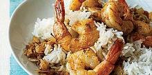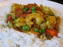 | Shrimp Curry and Rice olive oil, curry powder, mustard seed, coriander leaf, peas, coconut milk, carrot, onion, shrimp, salt, rice This tastes as good as classic slow-cooking curry, but is ready in a flash. Serve with crisp flat breads such as pappadams. Step 1 Prepare rice as label directs but do not add margarine or butter. St...