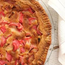 | Rhubarb Custard Pie Culinary Cafe vanilla extract, nutmeg, rhubarb, eggs, salt, pastry, sugar, milk, flour Preheat oven to 400 degrees F. Mix the all ingredients except pie crust together and pour into pie crust. Bake for 45 minutes or until filling sets firm. Cool to room temperature before serving. S...
