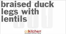 | Braised Duck Legs With Lentils Recipe | CDKitchen.com red onion, chicken stock, olive oil, thyme, pepper, parsley, bay leaf, lentil, carrot, celery, duck, salt, white wine A 5-star recipe for Braised Duck Legs With Lentils made with olive oil, carrots, celery, red onion, parsley, duck legs, salt and pepper, white wine In a large heavy skillet or flameproof casserole wit...