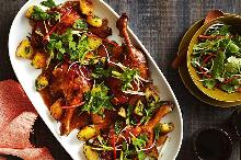 | Chinese-style braised duck legs with crispy potatoes - Recipes - delicious.com.au rice wine, chicken stock, five-spice powder, star anise, mint, ginger root, coriander leaf, red chili, potato, spring onion, garlic, duck, soy sauce, brown sugar, red wine You won't be able to resist licking your fingers after eating this sweet, sticky braised duck. 1. Preheat oven to 180 C. Place duck, skin-side down, in a frypan over very low heat and cook for 15...