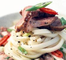 | Hot and sour duck noodle soup with baby pak choy and noodles - olive magazine. | olivemagazine duck breast, chicken stock, tamarind, coriander, red chili, lime, spring onion, fish sauce, noodles, brown sugar The best duck noodle dish for a hot and spicy Japanese-inspired meal for four. Udon are big fat noodles. Find them in Asian stores and larger supermarkets. Serve in deep bowls and serve with chilli, s...