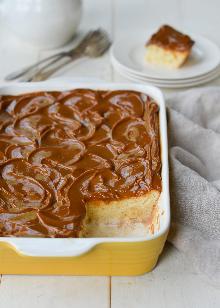 | Tres Leches Cake with Dulce de Leche Glaze - Once Upon a Chef egg yolks, egg whites, evaporated milk, heavy cream, oil, vanilla extract, salt, baking powder, sugar, dulce de leche liqueur, dark rum, condensed milk, water, flour TESTED & PERFECTED RECIPE – A light, fluffy and decadently moist tres leches cake with rum and dulce de leche glaze. Preheat the oven to 325 F and set a rack in the middle position. In a me...