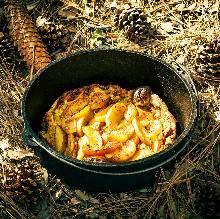 Apple Dutch Baby butter, vanilla, cinnamon, chokeberry/cooking apple, eggs, salt, maple syrup, brown sugar, sugar, milk, flour This puffed oven pancake doubles easily. You can make two Dutch babies or a single large one in a 12-inch skillet (increase baking time to 18 to 20 minutes). Preheat oven to 425 F. In a medium bowl co...