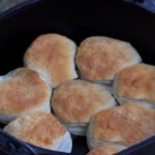 Dutch Oven Biscuits Recipe salt, baking powder, fat, milk, water, flour I love cooking in a dutch oven - these turn out great! 12-14 briquets on top and 10-12 briquets on bottom in a 12 or 14" dutch oven will give you a nice 325 degree oven Combine dry ingredients. W...