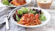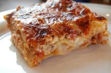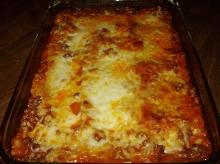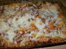 | Easy Lasagna Casserole Recipe - Food.com tomato sauce, garlic salt, onion, burger, noodles, mozzarella cheese, cheddar cheese, cream cheese, sour cream Super easy as far as lasagnas go. Tom doesn't really like lasagna, but he begs for this one to be made. Serving Size: 1 (193) g Servings Per Recipe: 9 AMT. PER SERVING % DAILY VALUE Calories: 4...