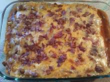 | Easy Bacon Cheeseburger Lasagna Recipe - Food.com tomato sauce, swiss cheese, ground beef, ricotta cheese, pepper, parsley, onion, eggs, bacon, salt, cheddar cheese, pasta, water Recipe is from Betty Crocker. Serving Size: 1 (389) g Servings Per Recipe: 8 AMT. PER SERVING % DAILY VALUE Calories: 619.4 Calories from Fat 303 g 49 % Total Fat 33.7 g 51 % Saturated Fat 17.9 ...
