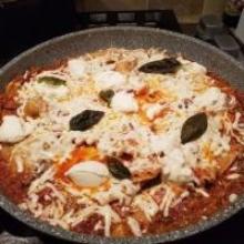 | Easy Skillet Lasagna With Fresh Basil Recipe ground pork, spaghetti sauce, ground beef, ricotta cheese, pepper, oregano, basil, onion, garlic, salt, parmesan cheese, mozzarella cheese, pasta, water Easy skillet lasagna with fresh basil and ricotta. You can substitute cottage cheese, if you don't like ricotta. After cooking this several times, I would pre-cook the pasta, use the pasta water, ...