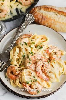 | Easy Shrimp Alfredo - Spend With Pennies butter, heavy cream, lemon peel, olive oil, pepper, parsley, nutmeg, garlic, shrimp, salt, parmesan cheese This creamy & easy Shrimp Alfredo pasta skillet is so quick to make! It's easy enough to cook for a weeknight, but elegant for company, too! Bring a large pot of salted water to a boil. Add fe...
