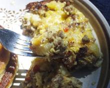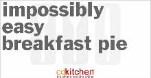 Impossibly Easy Breakfast Pie Recipe - Food.com hash brown, baking mix, pepper, onion, eggs, sausage, cheddar cheese, milk All the usual breakfast ingredients -- sausage, eggs, potatoes, cheese -- are baked into a pie that makes its own crust. This is a double recipe that bakes in a 9 x 13-inch baking dish if you...
