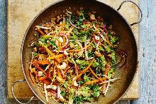 | Easy vegetarian stir-fry recipe - Recipes - delicious.com.au red onion, quinoa, olive oil, cashew, red chili, chili pepper, lime, carrot, bean sprouts, cabbage, soy sauce, honey “This simple stir-fry is light, yet full of flavour and colour. The lime gives it an added zing that pairs well with the sweetness of the toasted cashews and crunchy vegetables. Meat eaters can ...
