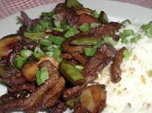 | Quick and Easy Stir-Fry Beef Recipe - Food.com beef flank steak, snap/snow peas, cornstarch, sesame seed oil, olive oil, ginger root, water chestnut, spring onion, vinegar, soy sauce, salt, sugar, water Great and EASY stir fry dish. I found this online in rec.food.recipes. I am planning to try it later this week with tofu for a veggie meal. Serving Size: 1 (183) g Servings Per Recipe: 4 AMT. PER SE...