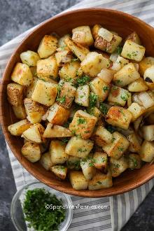 | Kittencal's Easy Seasoned Home Fries Recipe - Food.com butter, pepper, cayenne pepper, dried garlic, potato, seasoning This is easy but the potatoes will need a few hours or overnight soaked in cold water, the garlic powder and seasoned salt may be adjusted to taste, I have left the cayenne as optional I like to add i...