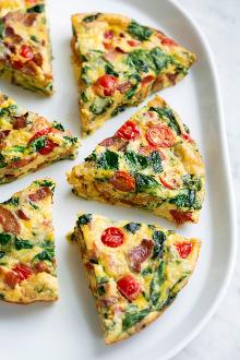 | Frittata Recipe {Easy Oven Method} - Cooking Classy swiss cheese, pepper, dried onion, dried garlic, tomato, spinach, eggs, bacon, salt, half and half The easiest tastiest Frittata recipe! It's made with plenty of eggs, rich bacon, vibrant brightly flavored tomatoes, fresh spinach and creamy Swiss Preheat oven to 350 degrees. Butter a 9 - 10 inc...