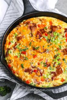 | How to Make a Frittata {Easy Breakfast!} - Spend With Pennies hash brown, olive oil, pepper, parsley, mustard powder, basil, mushrooms, potato, spring onion, eggs, bacon, ham, salt, cheddar cheese, cream Learn how to make a frittata with this easy recipe. Made with mixed vegetables, potatoes, bacon and shredded cheese this the best breakfast recipe! Preheat oven to 400 F. Add olive oil to an 8...