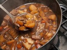 | Beef Goulash Recipe by Quick.easy.cooking | ifood.tv beef stewing meat, vegetable juice, pepper, onion Brown meat and onions in nonstick skillet. Add V-8 vegetable juice and pepper. Cover and simmer 1 1/2 hours. Recipe Summary Nutrition Facts Serving size Complete recipe Calories 1315 Calories fr...