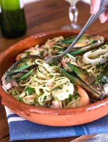 | Easy White Wine Marinara - Cafe Delites garlic flavored oil, pepper, parsley, lemon, onion, garlic, mussel, prawn, salmon, salt, pasta, white wine Easy White Wine Marinara - Cafe Delites In a large saucepan, fry onion and garlic in the oil Add mussels, salmon and calamari and cook for roughly 3 minutes. Add prawns and stir everything together,...