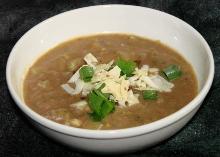 | Quick & Easy Mexican Soup Recipe - Food.com chili dried/powder, refried beans, chicken stock, pepper, green chili, spring onion, onion, garlic, celery, bacon, tortilla chips, monterey jack cheese, cheddar cheese, sour cream This recipe is really quick and easy, and the refried beans give a nice thick texture. I love the ease and the taste of this recipe. This recipe came from Southwest Seasons Cookbook. Serving Size: 1 (...