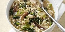 Easy Miso-Chicken Ramen Recipe | EatingWell chicken thigh, shiitake mushroom, miso, sesame seed oil, ginger root, spring onion, garlic, bok choy, soy sauce, noodles, water Warm up a chilly evening with this healthy chicken-and-vegetable ramen noodle bowl recipe. For a little spice, top with hot sauce, such as Sriracha. Look for dried curly Chinese-style noodles near oth...
