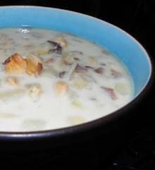 | New England Easy Clam Chowder Recipe - Low-cholesterol.Food.com evaporated milk, heavy cream, pepper, potato, onion, clam, bacon, salt, milk, water My friend gave me this recipe when we lived in Maine. Be sure and eat it with some good sour dough bread - maybe even inside a bread bowl (like they serve in CA). Serving Size: 1 (669) g Servings Per...