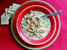 Easy New England Clam Chowder Recipe - Food.com butter, sweet onion, liquid smoke, seafood stock, chicken stock, pepper, oregano, potato, carrot, leek, garlic, celery, clam, bacon, milk, flour Easy New England Clam Chowder is the soup of the season! Creamy and delicious; prepare this main dish meal in a little over an hour for a hearty meal on a cold fall night! Serving Size: 1 (528) g Ser...