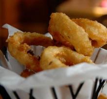 | Quick and Easy Onion Rings Recipe - Food.com chili dried/powder, oil, pepper, onion, salt, baking powder, beer/lager, flour Beer batter onion rings. Mild taste, great flavor. My kids love to make and eat these. Serving Size: 1 (225) g Servings Per Recipe: 4 AMT. PER SERVING % DAILY VALUE Calories: 1380.4 Calories from ...