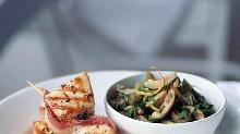 | Chicken and Bacon Skewers with Olive and Capers Salsa | Easy, quick and healthy recipe from HOUSE | chicken breast, olive oil, thyme, parsley, caper, lemon, olive, garlic, bacon Chicken and Bacon Skewers with Salsa. Tasty zesty skewers with a sultry summer bite! Easy recipe ideas from House & Garden. Step 1 Soak 8 wooden skewers in water for 10 minutes. Cut each chicken ...