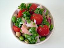 | Edamame and Bean Salad With Shrimp and Fresh Salsa Recipe - Food.com cannellini bean, red onion, olive oil, coriander, jalapeno, edamame, tomato, shrimp, salt, lime juice This recipe makes 1 serving. Triple the recipe to use the whole can of beans. Serving Size: 1 (297) g Servings Per Recipe: 1 AMT. PER SERVING % DAILY VALUE Calories: 299.1 Calories from Fat 104 g ...