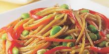 | Vegetable Lo Mein with Edamame & Mustard Greens Recipe | MyRecipes cloud ear mushroom, red bell pepper, hoisin sauce, sesame seed oil, canola oil, ginger root, edamame, soybean, spring onion, garlic, mustard greens, soy sauce, noodles, water Mustard greens' peppery bite contrasts with tender, fresh Asian egg noodles. If you can't find them, substitute fresh pasta such as vermicelli or spaghetti. The leftovers are tasty served warm...