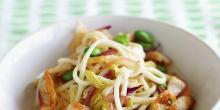 | Chicken, Edamame, and Noodle Stir Fry Recipe napa cabbage, chicken breast, red onion, cornstarch, oil, pepper, edamame, garlic, soy sauce, salt, rice vinegar, noodles, pasta A one-bowl dinner, Japanese style. If you can't find udon noodles, use linguine -- just break the noodles in half before boiling them. Edamame are green soybeans. In a large pot of boiling salted ...