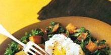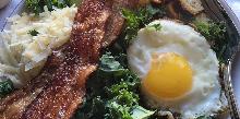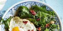| Baby Kale Breakfast Salad with Bacon & Egg Recipe | EatingWell olive oil, pepper, garlic, kale, eggs, bacon, red wine vinegar, salt Breakfast salad? Oh yes! Start your day off right with this healthy breakfast recipe. A bowl of good-for-you greens, such as baby kale, will knock out half of your daily veggie quota with the first me...
