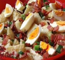 | Classic Potato Salad -With Bacon And Egg Recipe Video by OnePotChefShow | ifood.tv onion salt, pepper, dried garlic, potato, spring onion, eggs, bacon, mayonnaise Classic Potato Salad (with Bacon and Egg) is a sumptuous side dish, perfect for parties, barbecues or weekend gatherings. Baby potatoes are boiled and combined with crispy bacon, spring onions, boiled...