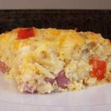 | Hammy Brown Egg Casserole Recipe sweet onion, red pepper, hash brown, ricotta cheese, pepper, green chili, eggs, ham, salt, cheddar cheese, half and half, flour Quick and easy! A tasty ham, egg, and hash brown casserole great for brunch or breakfast. Preheat oven to 350 . Spray 9" square baking dish with a non-stick spray. Spread hash browns evenly in b...