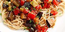 | Eggplant Pomodoro Pasta Recipe | EatingWell red pepper, olive oil, pepper, parsley, caper, basil, olive, garlic, tomato, aubergine/eggplant, red wine vinegar, salt, pasta Make this eggplant pasta recipe for a simple, tasty meal. We serve the eggplant pomodoro with angel hair pasta, but any type will work. Instructions Checklist Step 1 Put a pot of water on to boil. ...