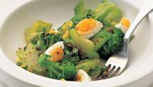 | Italian broccoli and egg salad recipe - BBC Food olive oil, tarragon, pepper, caper, leek, broccoli, eggs, salt, honey, lemon juice This is a delicious vegetarian salad, perfect for a healthy packed lunch. Place the eggs in a large pot, cover with cold water and bring to the boil. Once the water is boiling cook for a further 7-10 ...