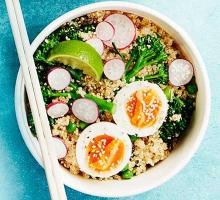 | Miso broccoli, egg & quinoa salad recipe | BBC Good Food quinoa, miso, sesame seed, peas, lime, radish, broccoli, eggs Pack a lunch that will power you through the afternoon with this healthy miso and lime-dressed salad with broccoli, peas, boiled egg and radishes. It's tasty and full of goodness STEP 1 Bring a p...