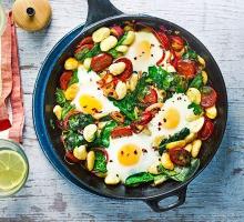 | Butter bean, chorizo & spinach baked eggs recipe | BBC Good Food red onion, chili dried/powder, chorizo sausage, olive oil, coriander, lima bean, garlic, spinach, eggs This budget-friendly, midweek meal is simple, satisfying and made in one pan. Less washing up, more flavour! STEP 1 Heat oven to 220C/200C fan/gas 7. Heat the oil in a medium frying pan (ovenproof if...