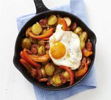 | Spanish eggs with chorizo & peppers recipe | BBC Good Food red pepper, chorizo sausage, potato, onion, eggs You'll need only five ingredients for this brunch-friendly one-pan recipe- let paprika from the sausage infuse the onion and new potatoes STEP 1 Steam the potatoes for 15-20 mins or until cooked....