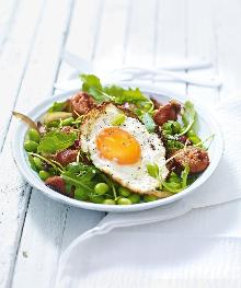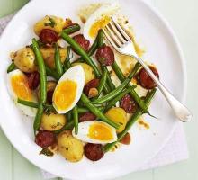| Chorizo & soft-boiled egg salad recipe | BBC Good Food chorizo sausage, parsley, potato, garlic, green beans, eggs, sherry vinegar This anytime summer salad will be on the table in just 30 minutes, from BBC Good Food. STEP 1 Cook the potatoes in a large pan of boiling salted water for 12 mins, adding the eggs after 6 mins, and t...