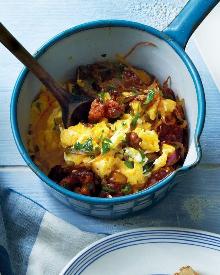 Chorizo and scrambled eggs recipe | delicious. magazine butter, red onion, chorizo sausage, olive oil, parsley, spring onion, eggs, cheddar cheese, milk Heat a drizzle of olive oil in a frying pan, then cook 1 red onion, sliced, over a medium heat for 10 minutes. Remove to a bowl. In the same pan, fry 250g cooking chorizo, skinned and crumbled, for 15...